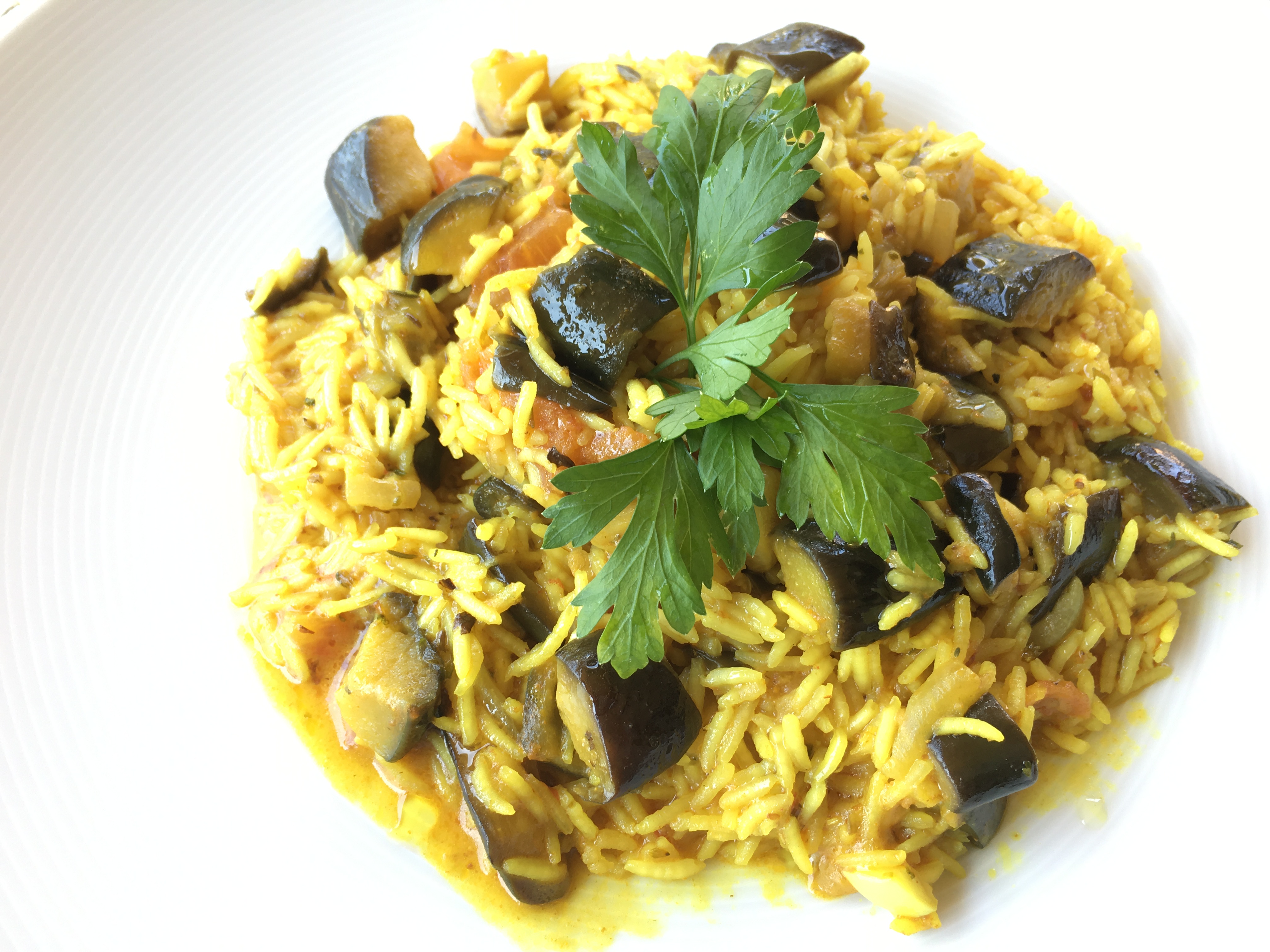 Lava y trocea las berenjenas y los tomates. Pela y pica la cebolla y los dientes de ajo. En una cazuela en la que habrás calentado un chorro de aceite, vierte las berenjenas y la cebolla, salpimienta, rehógalo bien y, cuando comienzan a ablandarse, añade el ajo. Vuelve a rehogarlo todo y vierte los tomates y las hierbas aromáticas. Mantenlo a fuego medio durante unos tres minutos aproximadamente para que se haga la salsa. Incorpora el arroz ya lavado, mézclalo bien y vierte agua caliente hasta que cubrir el arroz un dedo por encima. Añade la cucharada de curry y, en caso necesario, rectifica de sal y pimienta. Cuando el arroz esté medio cocido, vierte la crema de coco y baja el fuego para que no se queme y, dependiendo del tipo del arroz, vigila por si en algún momento hubiese que añadirse más agua. Cuando el arroz esté en su punto, retíralo del fuego y sírvelo caliente.